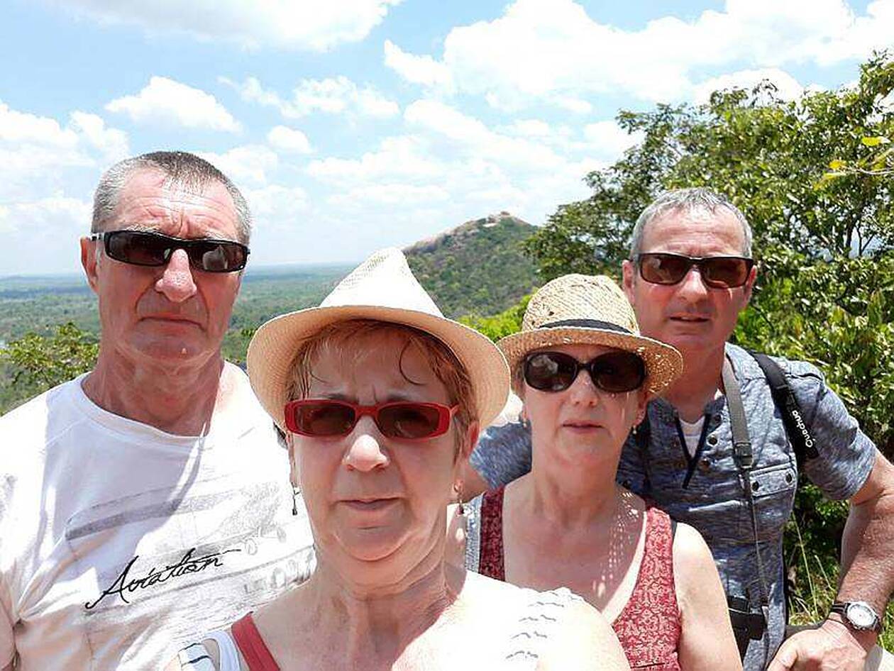 ANNE-MARIE (FOREGROUND) POSES WITH HER HUSBAND JEAN-CLAUDE (LEFT), HER SISTER AND BROTHER IN FRONT OF THE FAMOUS ARCHAEOLOGICAL SITE OF SIGIRÎYA, SAYS THE LION ROCK.